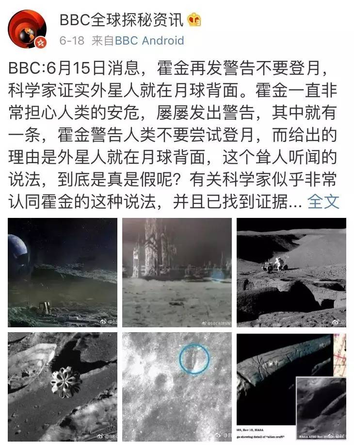 这则消息源于@BBC全球探秘资讯发布的一条微博,称霍金再发警告不要登月,因为科学家证实外星人就在月球背面。