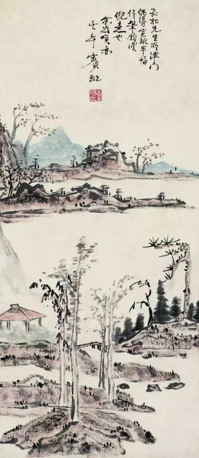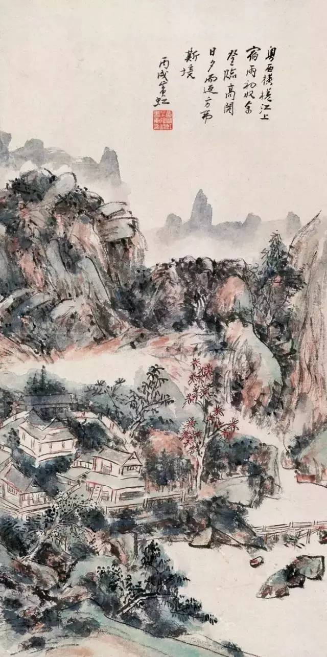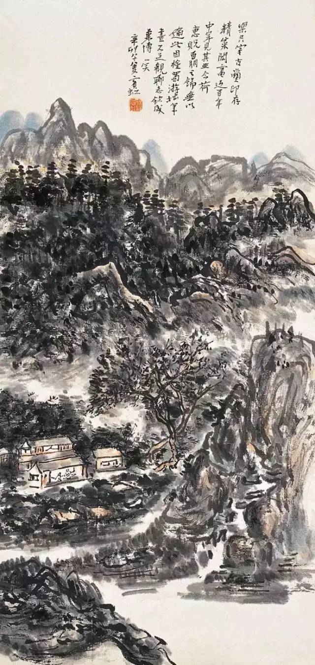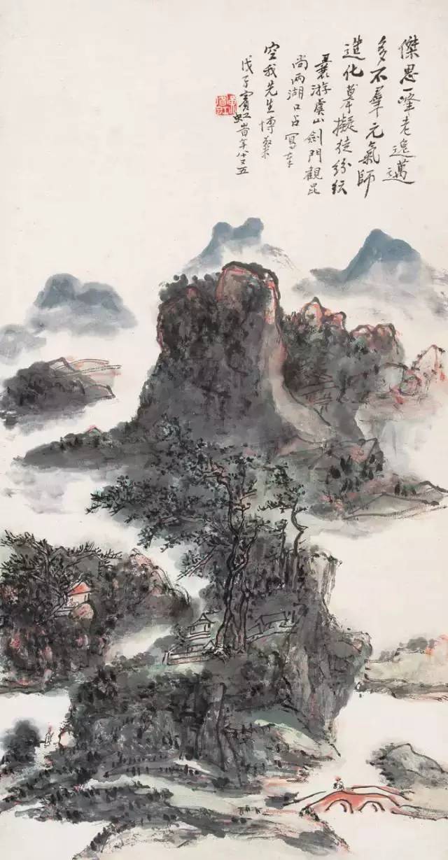 在北平的十一年,黄宾虹完成“黑宾虹”的转变后,又进行“水墨丹青合体”的试验。用点染法将石色的朱砂、石青、石绿厚厚地点染到黑密的水墨之中,“丹青隐墨,墨隐丹青”,这是受西方印象派启发,思以将中国山水画两大体系(水墨与青绿)进行融合的一大创举。