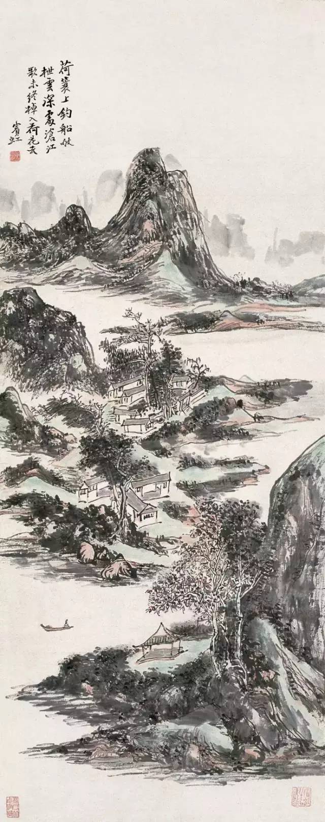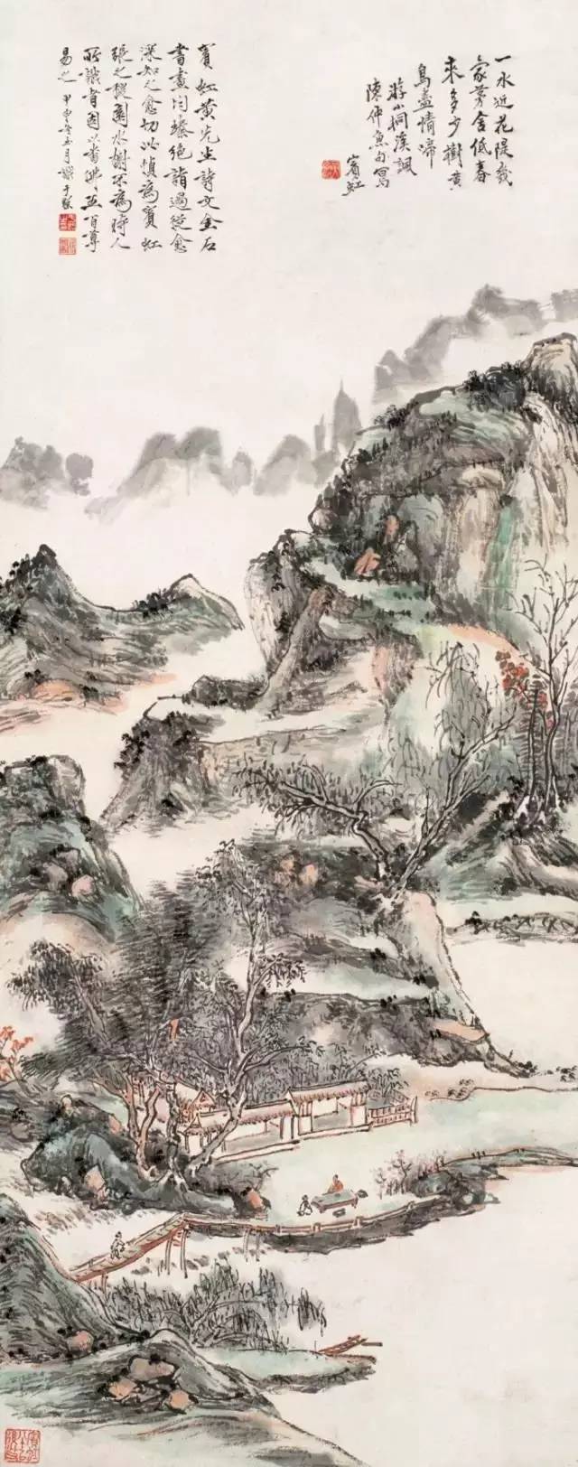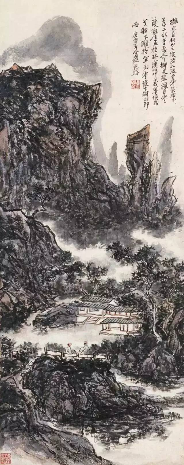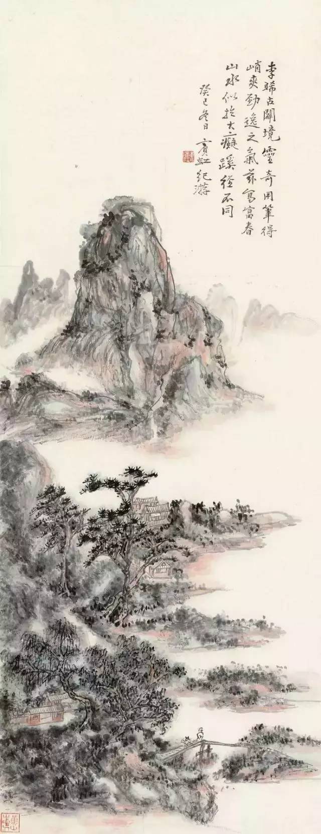 在北平的十一年,黄宾虹完成“黑宾虹”的转变后,又进行“水墨丹青合体”的试验。用点染法将石色的朱砂、石青、石绿厚厚地点染到黑密的水墨之中,“丹青隐墨,墨隐丹青”,这是受西方印象派启发,思以将中国山水画两大体系(水墨与青绿)进行融合的一大创举。