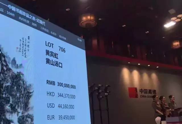 2017年6月19日晚,中国嘉德重点专场“大观中国书画珍品之夜·近现代”中,黄宾虹经典之作《黄山汤口》最终以3.45亿元成交,创其个人作品最高成交价,买家是山东某新能源汽车集团。