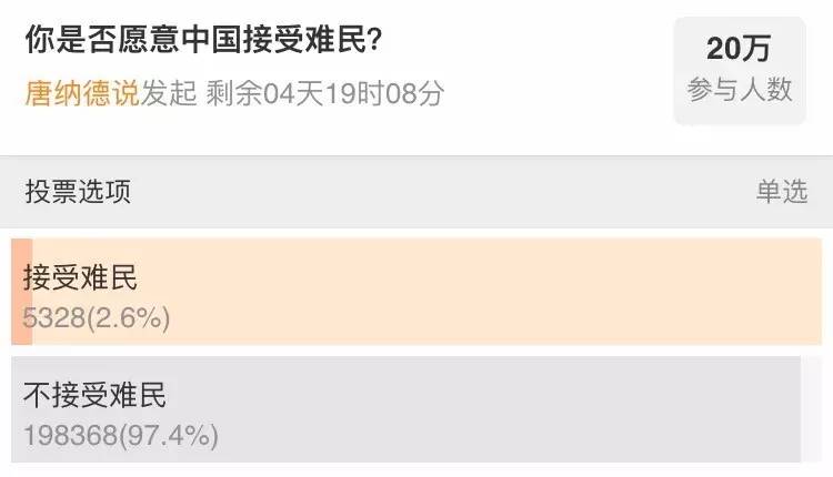有网友在微博上发起了“你是否愿意中国接受难民”的投票,选择“愿意”的不到3%。
