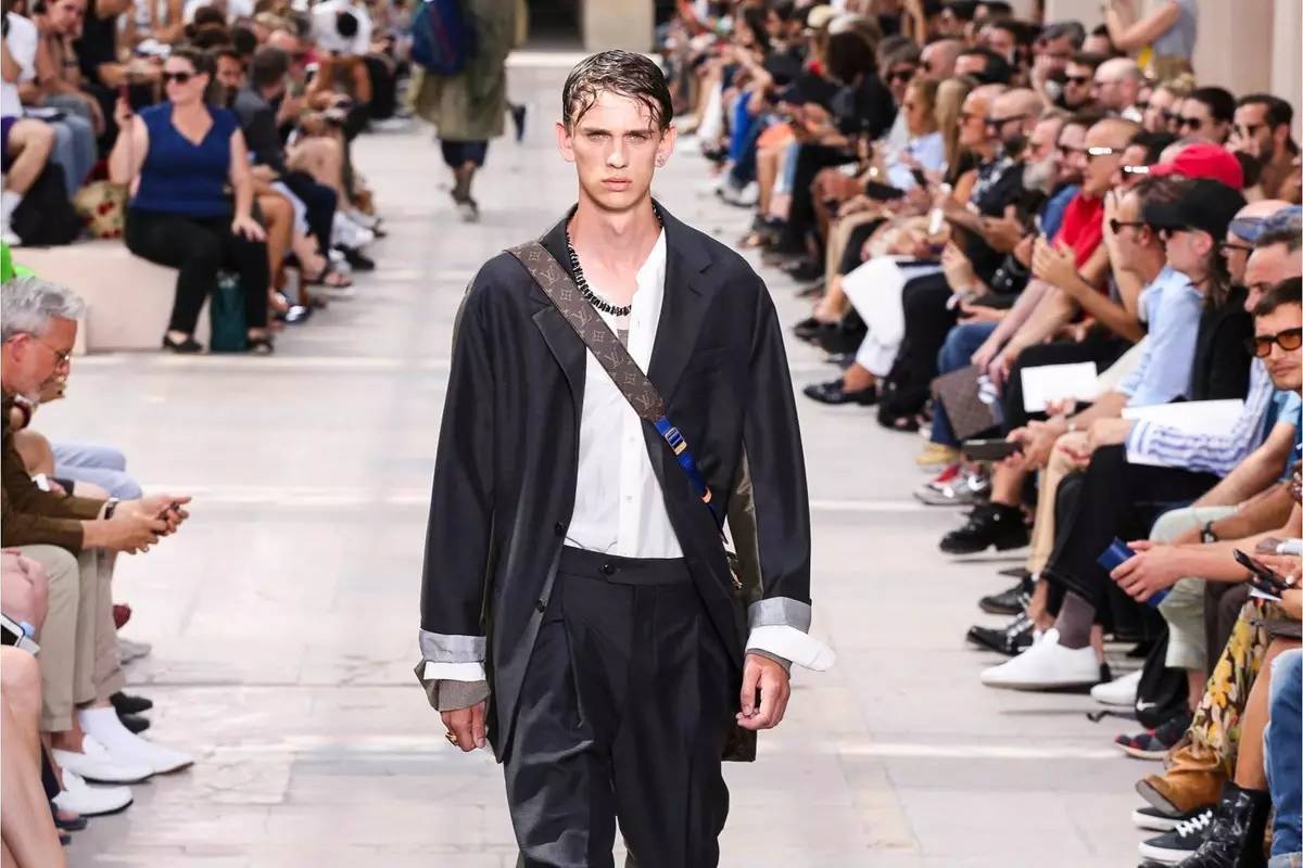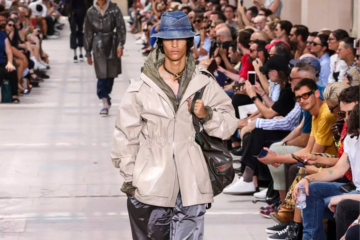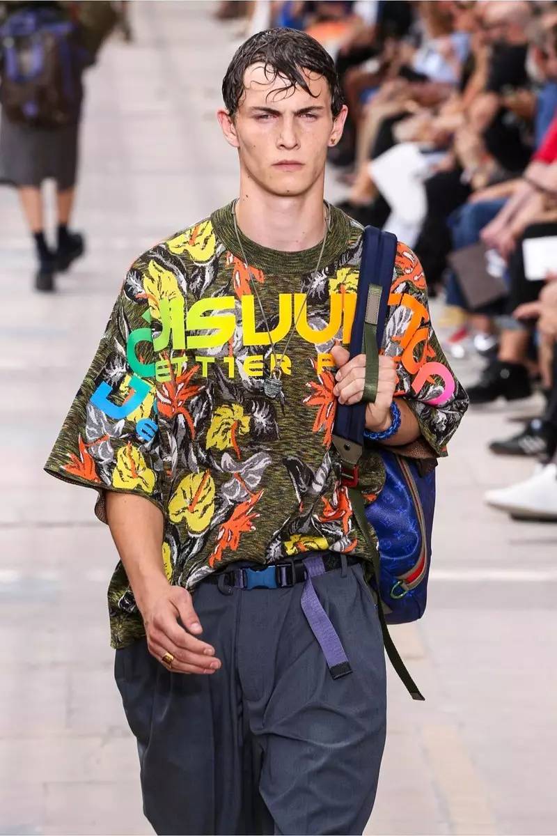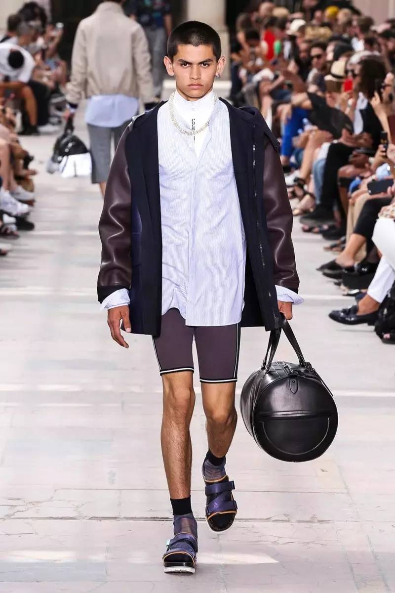 从欧根纱到真丝再到潜水面料,拉链高领衫,三层叠搭而出的衬衫,针织,西装套与标志性的运动鞋或凉鞋,这些Kim Jones最擅长的设计手法仍然在主导整个系列,不同的是个别细节处的巧妙处理,比如那条明拉链运动裤,无袖的针织开衫和加大廓形,收紧腰身的parka还有登山口腰带。