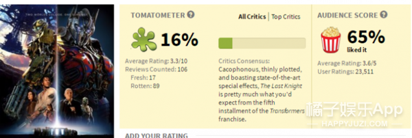 24,《变形金刚5》的烂番茄评分只有16%的新鲜度,挺低的。