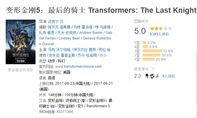 《变形金刚5》首日票房超3亿,但评分却首次“不及格”