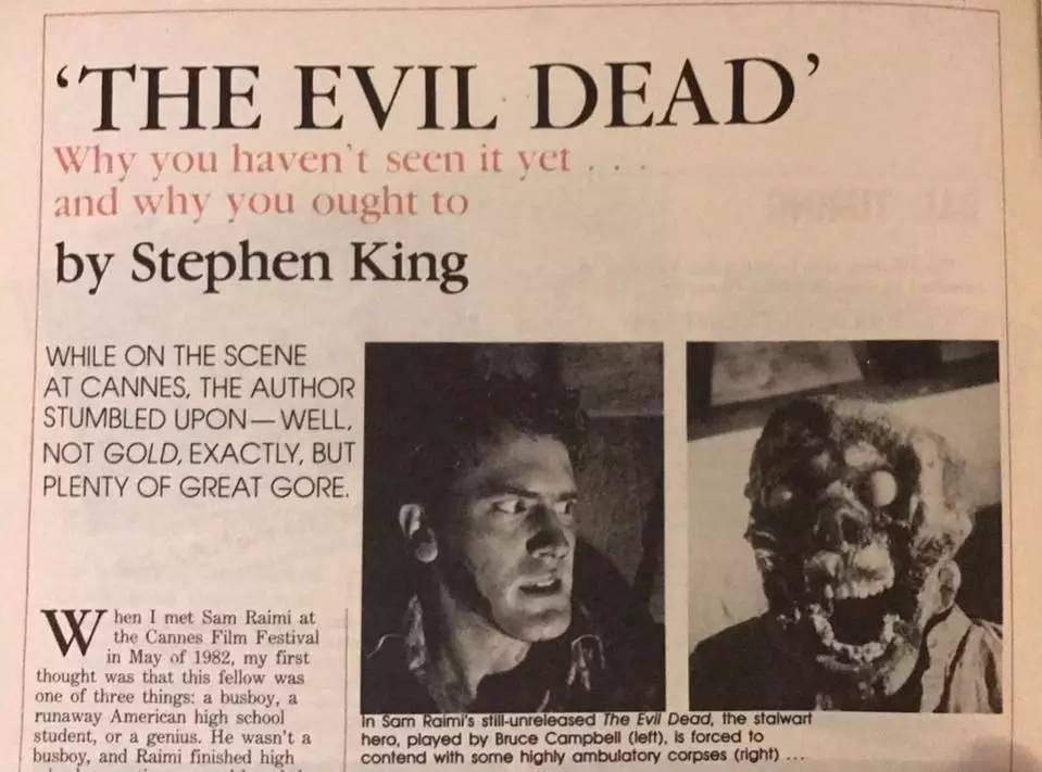 1982年,山姆·雷米靠东拼西借的35万美元拖家带口完成了《鬼玩人》后,在底特律的雷德福剧院(Redford Theatre,因为男主角坎贝尔经常在那儿看电影)的首映式上迎来一千名观众。那时候的《鬼玩人》还叫“死亡之书”——几个月过后,一代传奇制片人Irvin Shapir建议雷米改掉这个带“Book”的片名,还利用自己“戛纳创始人之一”的身份,将此片推向了戛纳非竞赛单元展映。坐在卢米埃大厅里的观众还包括史蒂芬·金,老爷子扭头为雷米在《今日美国》和《阴阳魔界》杂志上面写了两篇文章,据说新线影业也正是因为这两篇文章才斩钉截铁地买下了《鬼玩人》的发行权。