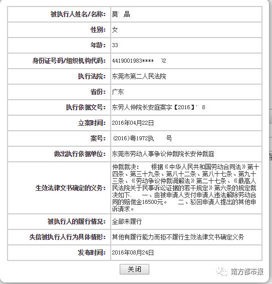 南都记者另外登陆了最高人民法院官网的全国失信被执行人查询系统,输入莫某晶的名字查询发现,该系统也显示有一名东莞籍、年龄也为34岁的女性被执行人,其名下因牵涉2宗债务纠纷未履行支付义务,被东莞当地法院纳入失信被执行人名单予以曝光。