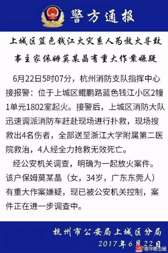 当日傍晚,杭州市公安局上城分局在其新浪官方微博“平安上城”上通报,上城区蓝色钱江火灾系人为放火导致,事主家保姆莫某晶(女,34岁,广东东莞人)有重大作案嫌疑,现已被公安机关控制,案件正在进一步调查中。