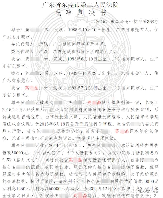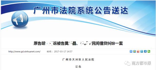 对此南都记者通过搜索得知,相关权威网站上的确曾于今年3月17日披露过一宗民间借贷案件的送达公告。据该公告内容显示,被告方莫某晶因民间借贷,被广州市某区级法院一审判决需偿还原告方借款3万元及利息。由于莫某晶未按期到法院领取判决书,法院选择了在权威网站上进行公告送达。