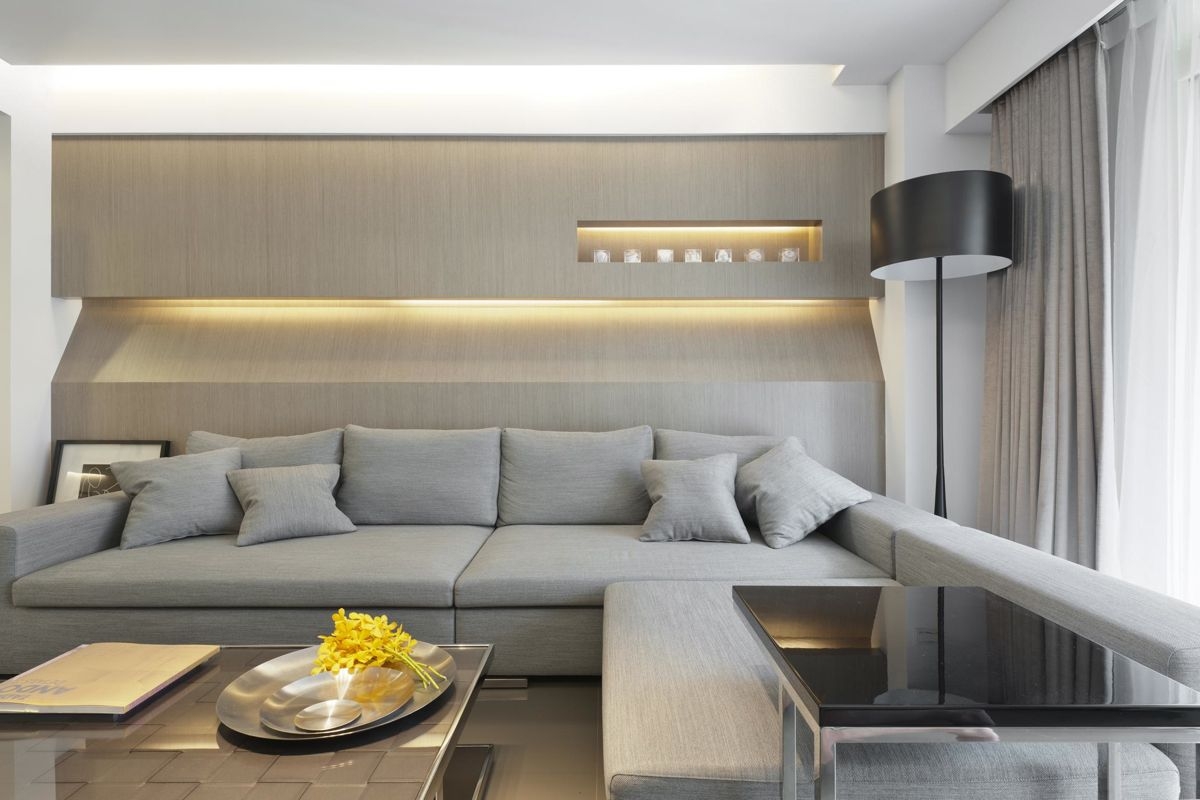灰调的布艺沙发,沙发墙以独特的藏光造型搭配,呈现出一个舒适简洁的优雅氛围;