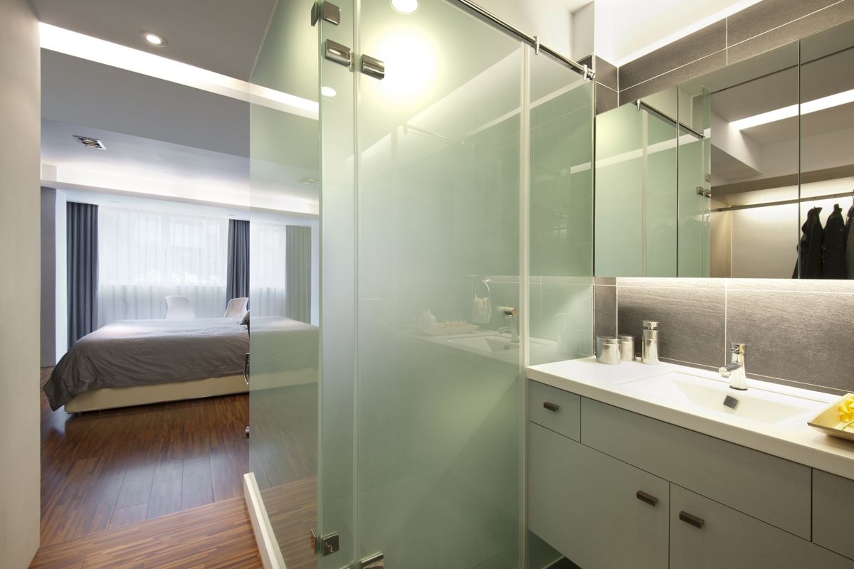 卧室里以玻璃隔断做个卫生间,简洁的氛围质感,整体显得格外的优雅大方;