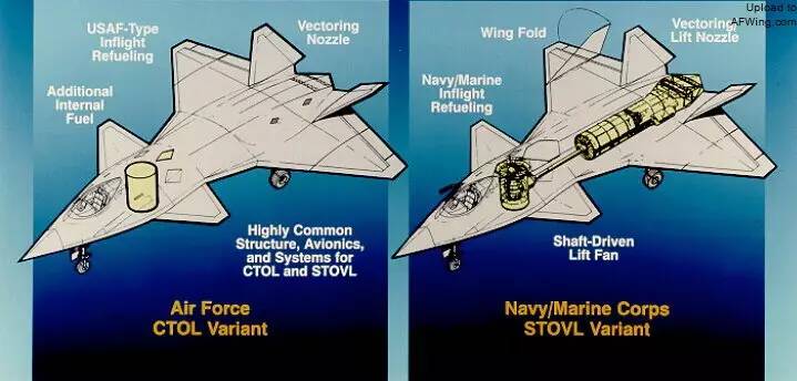洛克希德在CALF项目项目中设想的常规起降型和安装升级风扇的STOVL型,常规型的升力风扇位置安装一个油箱