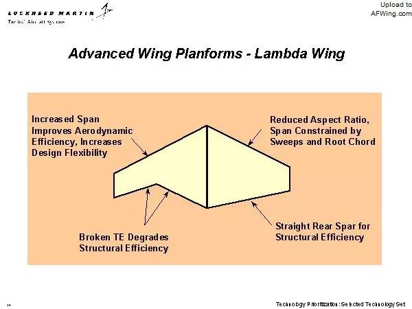 所谓的LAMBDA主翼是一种形状独特的主翼,主翼后缘具有一前掠角与后掠角,增加了展弦比,使高空气动效率胜过梯形翼,于中低空时也有相当的机动性,大面积的襟副翼透过差动还能补足失去的垂直尾翼功能,并搭配矢量喷管增加机体机动性。