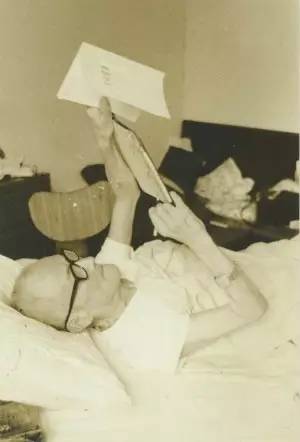 他1972年去世前最后一张照片,这张照片是在澳门。他最后病危的前夕,在医院里面的病床上,他已经人都坐不起来,他拿一块板,手那么举着在写稿子,人已经瘦得不像样子还在写着,因为报纸上的专栏还在等他的文字。
