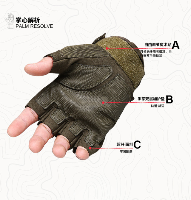 战术手套对使用者手部的防护性明显强于普通手套。其掌部、手背部、指部、指关节部分均进过特殊加固处理,以此提升战术手套的防护性。