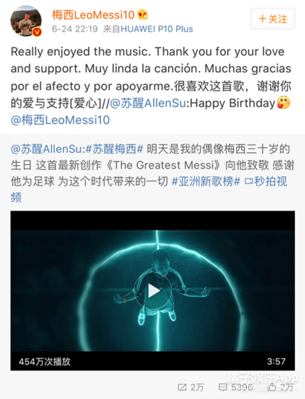 ▼上周末6月24日是梅西生日,苏醒发布了一首原创新歌《The Greatest Messi》,作为其偶像梅西三十岁生日的献礼之作,没想到被偶像亲自转发,简直就是史上最幸运粉丝!
