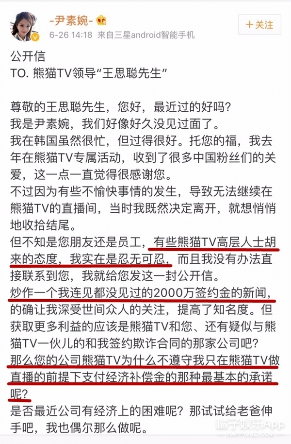 ▼曾被曝2000万签约王思聪的直播平台,有韩国第一女主播之称的尹素婉发文称将离开熊猫TV。她表示从未见过签约金,同时指控熊猫TV恶意扣留其粉丝礼物,并要求其归还,不过公司随后回应称尹素婉所言绝非属实,熊猫公司并没有炒作2000万签约金,纯属主播个人炒作.......