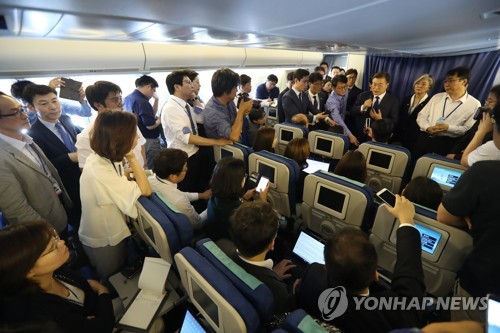 6月28日下午,韩国总统文在寅(居中,手拿麦克风)在专机上回答记者提问。(韩联社)