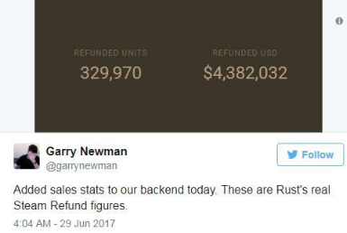 近日,《Rust》游戏制作人Garry Newman在推特上透露,目前,总共有329,970份的《Rust》被玩家退款,退款总额达到了4,382,032美元。这对于550万拥有《Rust》游戏的玩家来说,33万份已经不算少量。