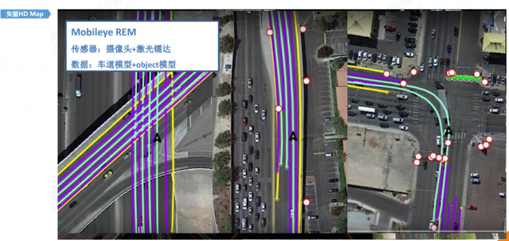 在Mobileye的REM地图中,有道路边缘线、车道中心线、车道边缘线以及静态物体的标示(上图中各种颜色的表现和圆点)。