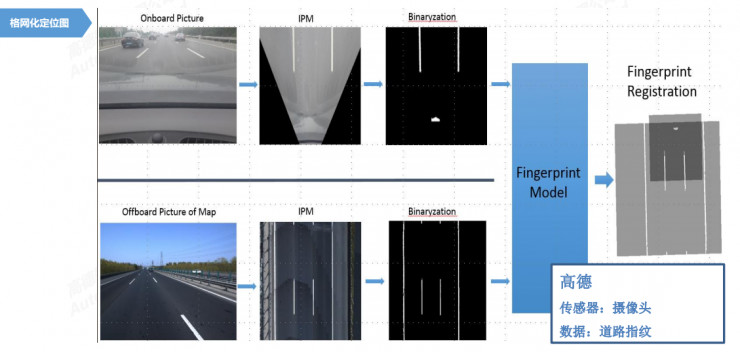 这个方案是基于摄像头的,用摄像头看到地面以后,我们把看到的图像做一个正射,正射完就得到一个纹理,将纹理预存下来,等到车辆再次去到这个位置的时候,只要其用的是同样的算法、同样装载着预存下来的图,经过对比以后,也能很精确的知晓自身车道级的位置。