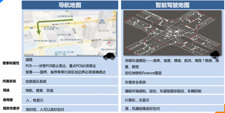 从内容和形态上开,高精地图和导航地图存在着很大的差别,具体表现在以下的多个方面。
