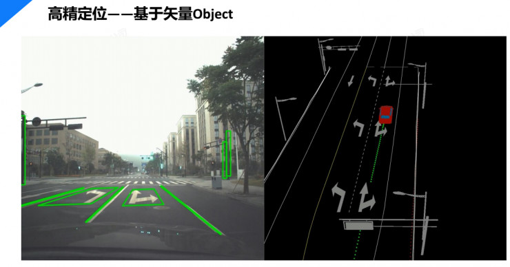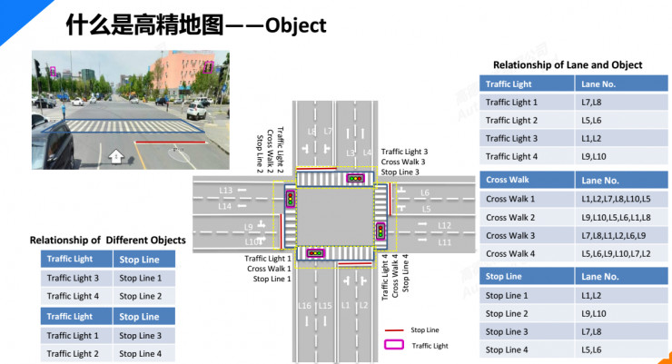 车辆在定位时一个基本的方案是用车端的传感器识别各种物体,然后将这些物体与地图上记录的物体进行对比,一对比之后车辆就知道自身处在什么位置。当然还有一些特殊的地物如斑马线、停止线、红绿灯等,控制着不同的路口和不同的方向,那么在数据中,我们就需要把这些关联关系表达进去,让自动驾驶汽车在这些地方可以顺利做出决策。