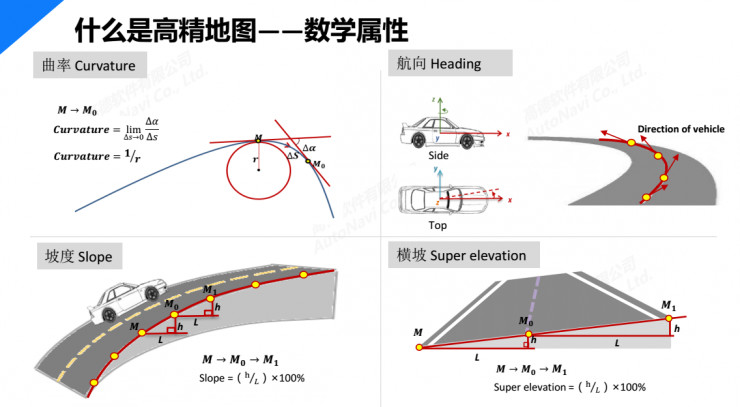 高精地图中还有一些比较特殊的数学属性,包括道路的曲率、航向、坡度以及横坡。这几个属性可以指导车辆以什么样的速度和角度进行转向而不至于出现事故。这也是高精地图重要的构成部分。