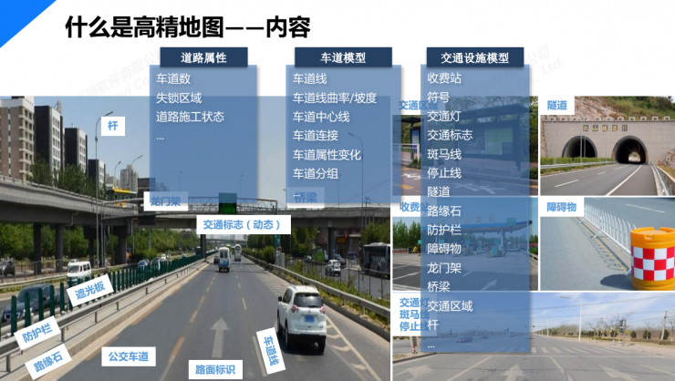 道路部件则是路上的各种物体,包括标志标牌、路面标志、龙门架、桥之类;