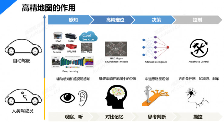 人的眼睛、耳朵其实就是自动驾驶汽车的感知系统要取代的;而高精定位方面,人可以通过观察和记忆,而自动驾驶汽车只能通过高精地图以及其创建的环境模型;而到了决策一步,人是通过自己的思考和判断来达成,而自动驾驶汽车则可以通过人工智能实现车道级的路径规划,这一方面其实高精地图也要发挥作用;当然,最后一步的控制,人是通过运动神经来操控,而自动驾驶汽车则需要自动化控制的系统来完成,在这一环节,自动驾驶汽车需要决定自身以什么速度穿越某些路段,而且还要保证安全。
