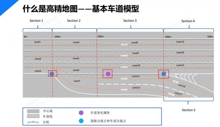 比如在车道变化属性点,车辆可以通过传感器探测到相关信息,然后再对比地图,便可清晰地知道自身处在什么样的位置。而且在路径规划的时候,车辆也知道在哪个位置进行并线是合理的。此外,为了方便计算道路连接关系,还会将道路分成多个组(Sections)。