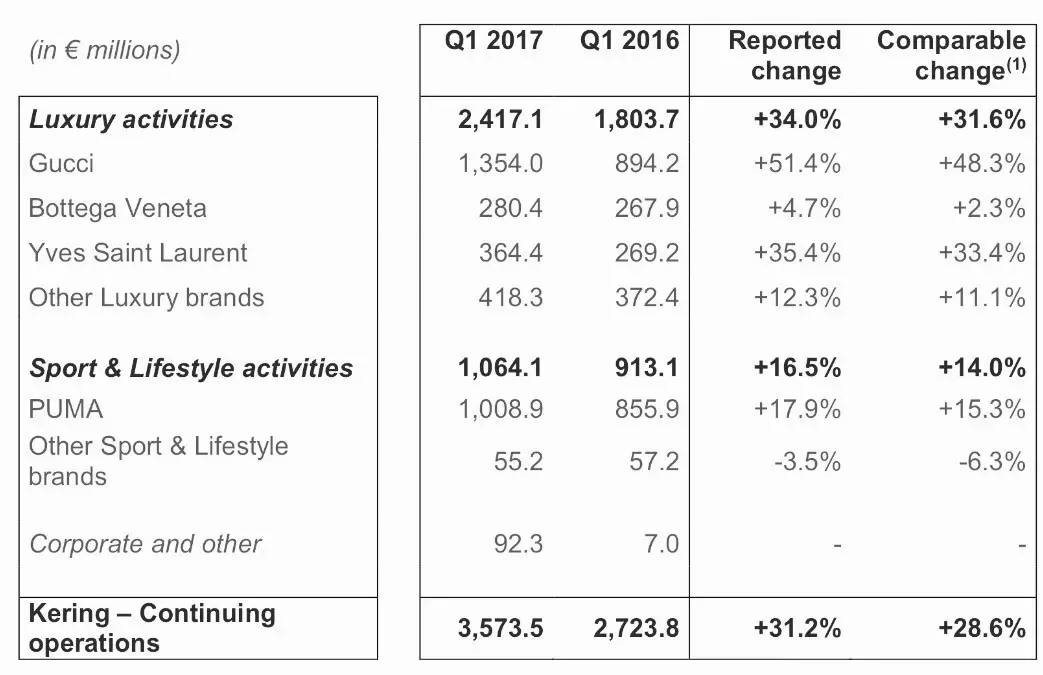 虽然频繁关店,但Gucci近来业绩表现不错,据Gucci母公司开云集团公布2017年第一季度财报,GUCCI收入录得猛涨51%至13.54亿欧元,同比增长48.3%,是20年来最强劲的增长,为开云集团贡献了三分之一以上收入。