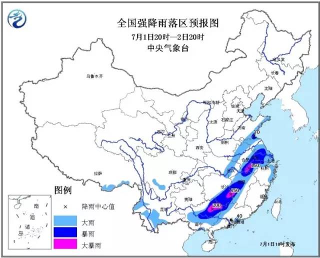 中央气象台预计,7月1日20时至2日20时,广西大部、广东北部、湖南南部和东部、湖北东部、江西大部、苏皖地区大部、浙江北部和东部、山东东南部、河南东南部等地有大到暴雨,其中,广西东北部、湖南南部、江西西部、安徽南部等地局地有大暴雨(100~200毫米);上述部分地区有短时强降水、局地伴有雷暴大风等强对流天气,最大小时雨强30~50毫米,局地可超过80毫米。