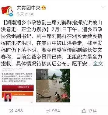 7月1日下午,湘乡市政协党组副书记、副主席刘鹤群在湘乡金薮乡指挥防汛抗洪时,在暴雨中被山洪卷走。