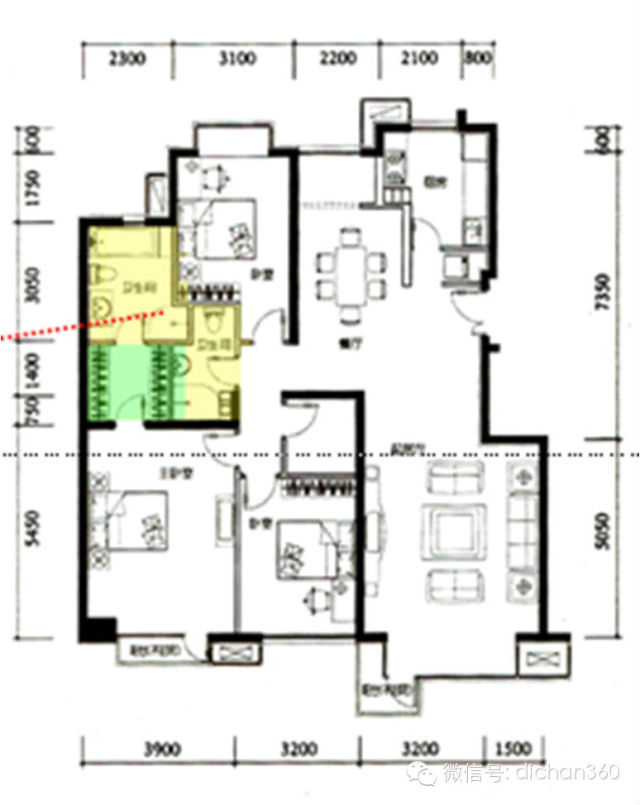 卫生间不采光:虽然做到了次卫干湿分离,但公共卫生间洁具摆放不合理。主卫、次卫均为黑房,通风采光不良。