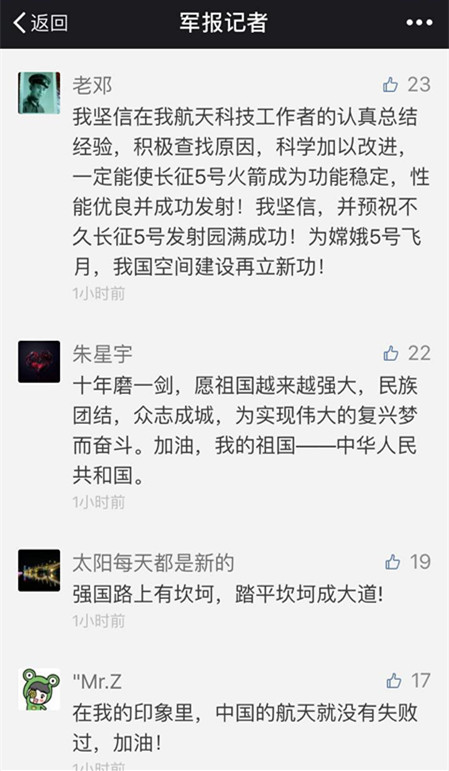我们的每一次航天发射,都凝结着中国航天人持之以恒的付出与汗水。今夜“胖五”发射任务虽然失利,但是中国航天人对太空探索的脚步没有片刻停止!一位位网友在“军报记者”微博跟帖留言中,给中国航天人加油鼓劲:从失利中汲取教训,尽快爬起来,奋力前行!