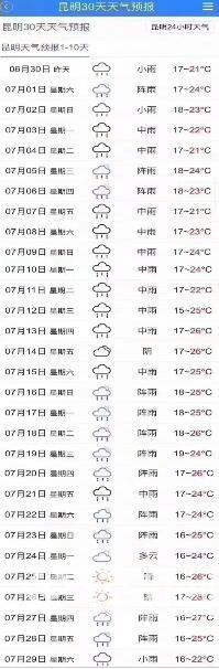 云南网讯 进入雨季后,昆明的雨下得颇有点江南梅雨的意思。昨天,一张未来30天的天气预报图,刷爆了昆明人的朋友圈,让已经经历了半个月雨天的昆明人彻底抓狂了。雨水把我们送进7月之后,还要纠缠一整个月?气象专家辟谣说,这份预报非官方出品,毕竟气象部门通常只做未来7天内的预报。而且就算是主汛期,雨水也会喘口气的。明天开始,阳光可能就回来了。
