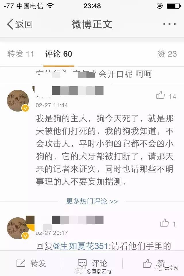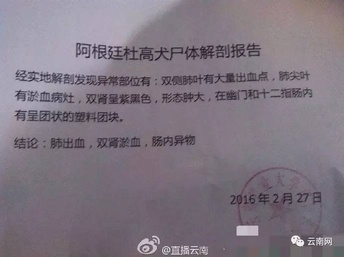 在云南某大学出具“死亡报告中”,涉事杜高犬肺出血、双肾淤血,肠内异物。他希望通过调取监控等方式,看看狗在伤人前是否曾被激怒,待情况搞清楚后,再与伤者谈论赔偿等问题。