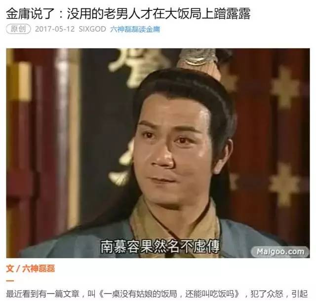 “没有姑娘的饭局”成为热点时,六神磊磊用《金庸说了:没用的老男人才在大饭局上蹭露露》回应。