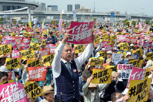 今年5月,数万日本民众参加“和平宪法”颁布70周年纪念集会。(新华社)