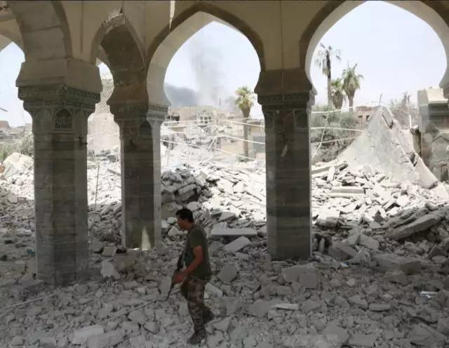 6月21日,当反恐部队在老城区推进至地标性建筑努里清真寺附近时,“伊斯兰国”武装炸毁了这座清真寺及其历史悠久的宣礼塔。