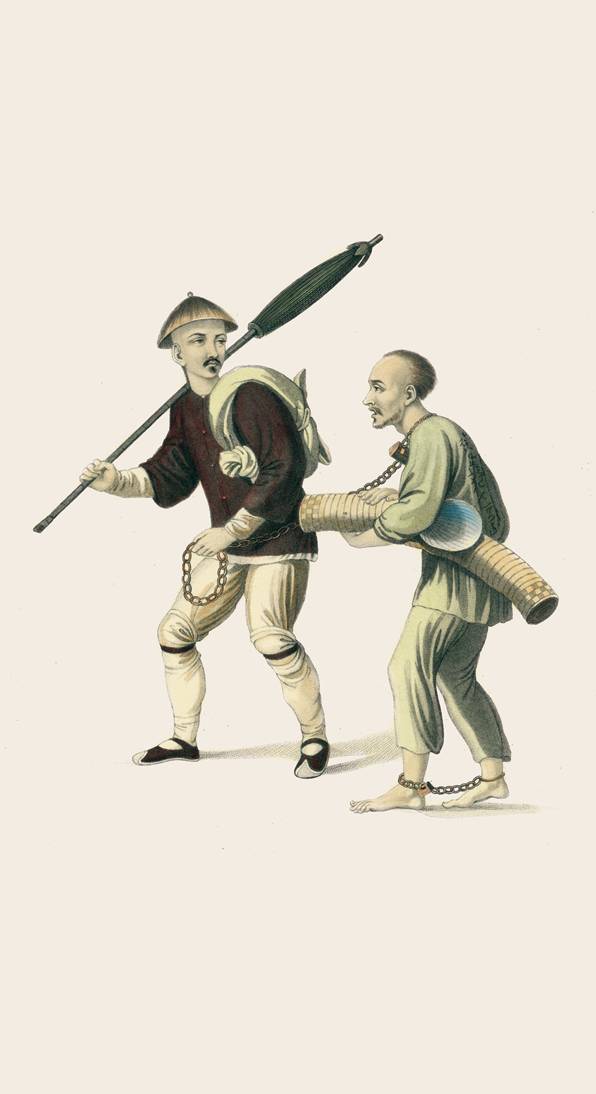 如图所示,犯人正在衙役的看管下前往流放之地。他随身携带了一床席子和一片遮雨的棕榈叶。犯人的背上清清楚楚地写明了他的罪行、处罚以及他的名字。