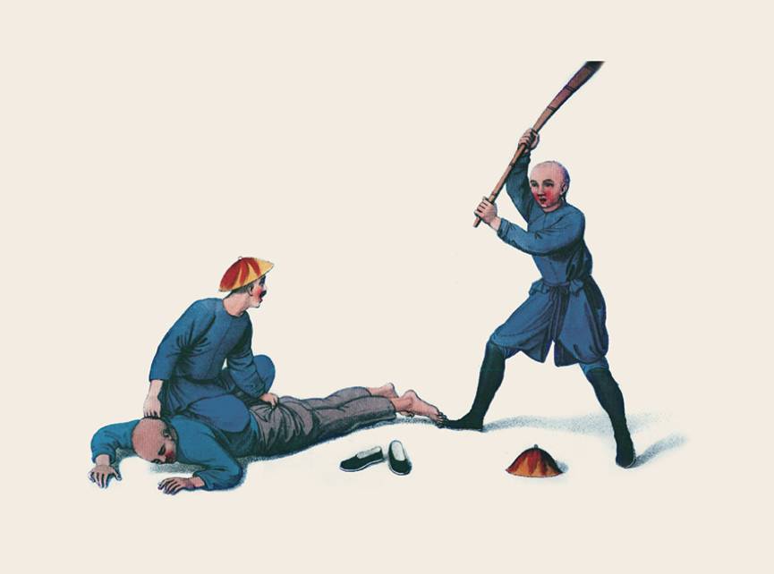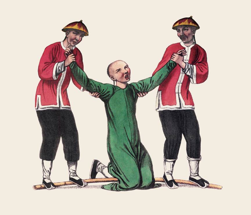 在犯人膝关节处放上一根大竹杖,两个衙役分别站在竹杖两端,他们互相靠近,便会增加犯人的痛苦,他们拉开距离,便可减轻犯人的痛苦。如果译者故意把翻译搞错,一经查明,便会被施以这种刑罚。