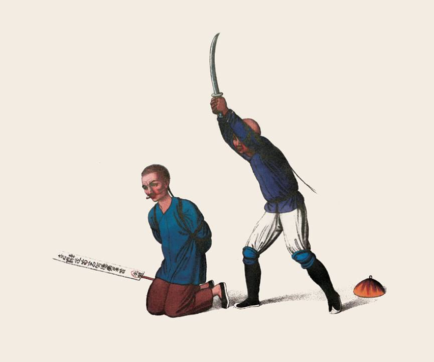 斩首是令犯人感到最为耻辱的刑罚,只适用于那些政府认定为罪大恶极的罪行:诸如私下密谋、公开行刺,以及任何反对皇帝本人和危害皇室成员生命安全的行为。造反、叛乱、殴打父母,以及其他有悖伦理纲常的罪行。犯人跪在地上,他背后的罪行牌也被摘下,刽子手双手抡起大刀,熟练地砍掉犯人的脑袋。刽子手和中国的大部分低级衙役一样,都是根据粗俗的陋习,从军队中挑选出来的。没有国家像中国一样,把刽子手这一职业看作最为低贱的执法人员。斩首被中国人视为最可耻的一种死法,因为脑袋是身体的重要部分,尸首异处,无法完整地安葬,对不起生养自己的父母。一个清朝高官,如果他犯下暴行,也会像最卑贱的老百姓一样被砍掉脑袋。脑袋被砍掉后,通常还要吊挂在通衢大道旁的大树上,尸体被扔进沟渠。法律认为被斩首的罪犯无须按照常规的丧葬仪式来安葬。