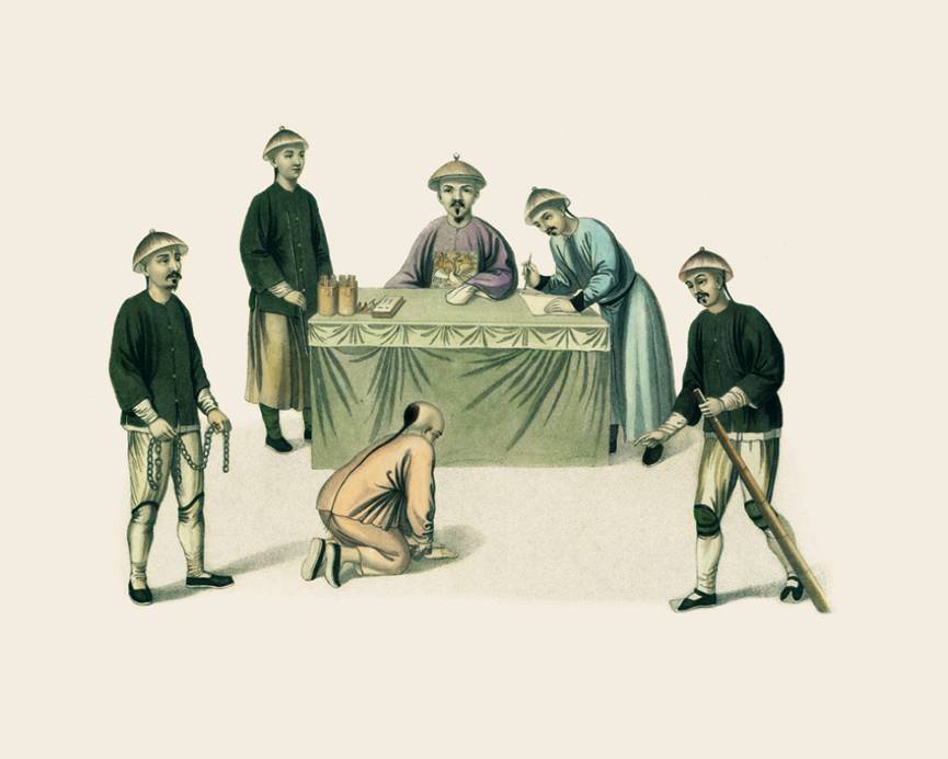 在中国,官员每天早晚都要在府衙内升堂审案,这已经成为一种习俗。师爷或者书办,以及手拿铁链和板子的下级衙役侍立在两旁。起诉人或者是告密者站在官员右手边,官员前面的桌子上铺着绸布,上面放着书写的工具,以供师爷记下口供和辩护词。供词用黑笔书写,犯人用红笔签名,然后盖上红色的印章。桌子上放着红头签,盛放在一个敞开的签筒里,出现下面这种情况,可能会用到它们:犯人罪行轻微,官员当庭判罚,然后释放他。这种情况下,通常是打犯人板子,我们可以通过官员扔到地上的签子数目来推断打多少板子,一根签子代表5大板。审讯期间,犯人一直是跪伏在地上,等候判决。开始行刑的时候,衙役就会像接下来的某张图中一样抓起犯人。官员扔出令签之后,就会谈些其他事情,喝口茶或者抽口烟。
