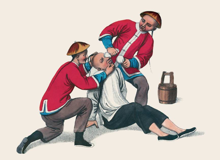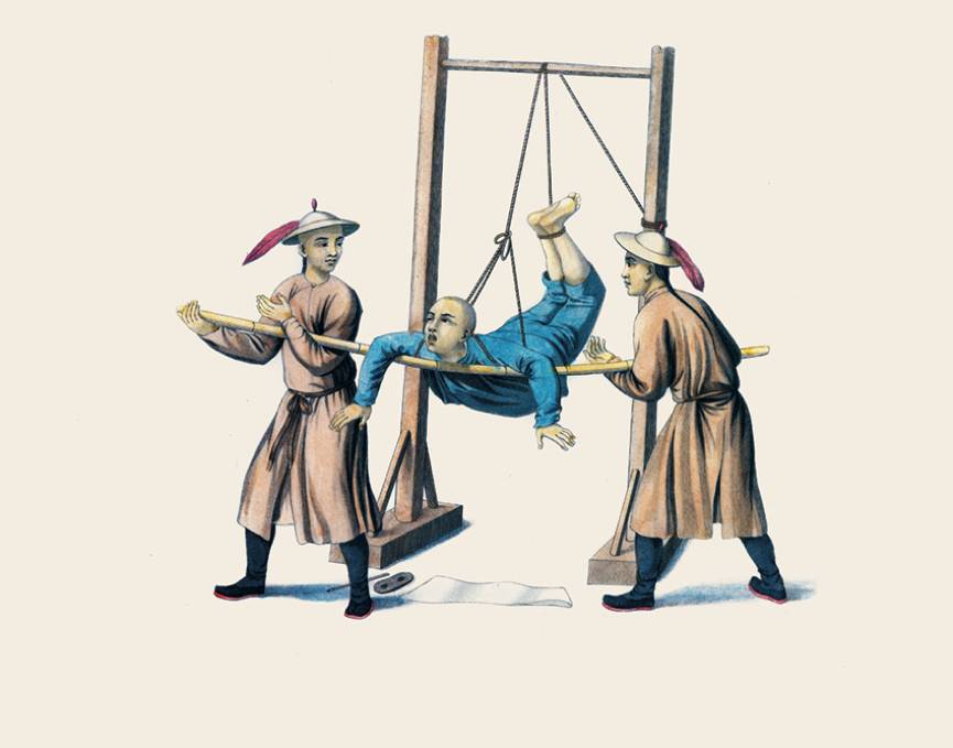 犯人被捆绑住双肩与脚踝,悬挂在半空中,非常痛苦。在场的两个衙役隔一段时间就会把一根竹子架在犯人胸前,这样会稍微减轻他的痛苦。他们准备好了笔墨纸砚,时刻准备记录下犯人的口供。悬吊和前面的拧耳朵,惩罚对象主要是那些从事商业欺诈、偷税漏税以及其他非法贸易的商人。