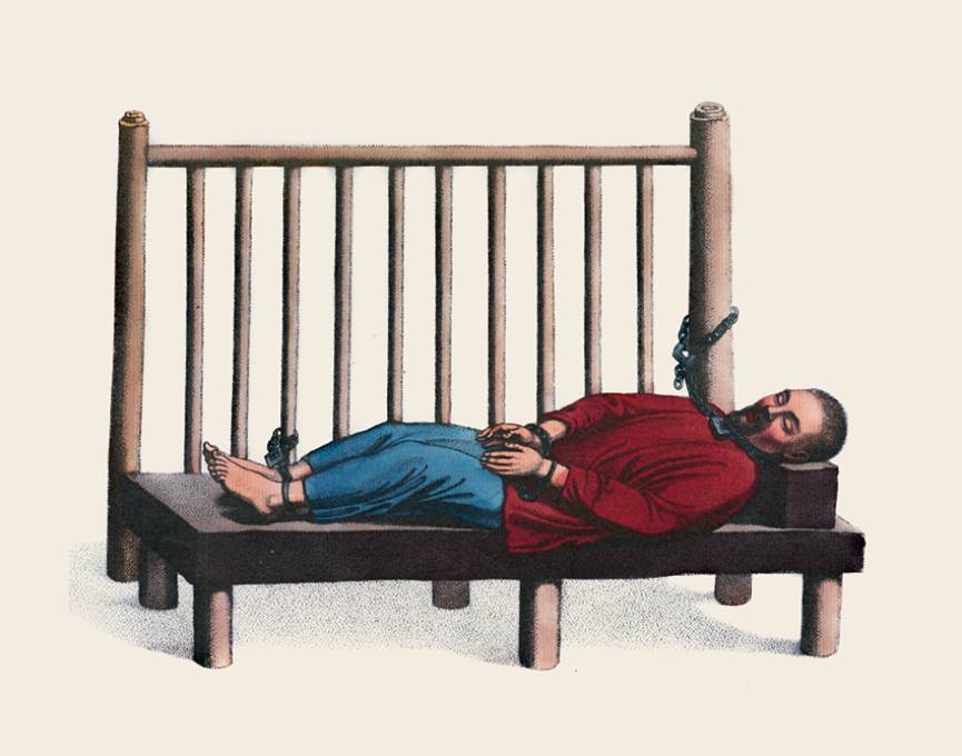 犯人浑身上下捆得结结实实,平躺在床架上,头下枕着一块木头。犯人双手戴着手镣,双腿戴着脚镣,脖子被用链条拴在床柱上,链条上挂着两把锁。