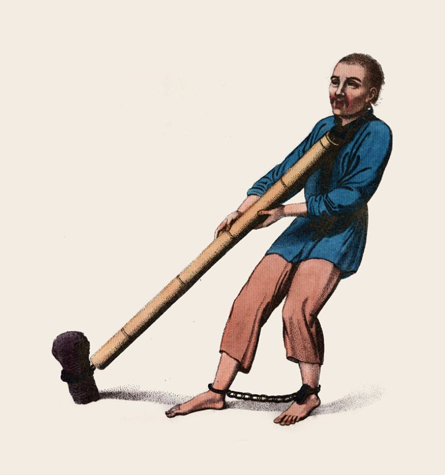 这是一种令罪犯深感耻辱的刑罚。木枷由厚重的木板组合而成,木板中间有个洞,可以容纳犯人的脖子。戴上这个木枷之后,犯人既看不到自己的脚,手也够不到自己的嘴。他无法在任何地方长时间停留,得不到足够的休息。犯人一天到晚戴着木枷,木枷有轻有重,这个要根据罪行的性质和犯人的力气来定。普通的木枷有五六十磅重,但也有两百余磅的重枷。戴枷的犯人要忍受巨大的痛苦,在羞耻、疼痛、饥饿以及无法休息等折磨之下,很多人因此而死亡。