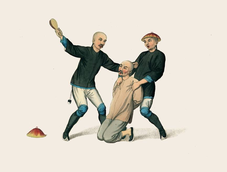 这种惩罚专用于船夫,在英国,船夫也被称为水手。犯人已经被定罪,被迫下跪。一个衙役站在犯人身后防止他后退,另一个衙役抓住他的辫子,用厚皮革制成的双层拍子抽打几下他的两颊。