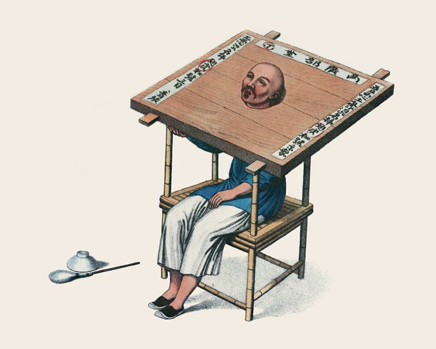 不过,犯人还是找到了各种方法来减轻刑罚。他们与亲属、朋友同行,让后者支撑木枷的边角以防止它压迫肩膀。把木枷搁在桌子上、长凳上或者靠在树上。或者如图所示,造一把特殊的椅子,椅子上竖起四根等高的木柱来支撑木枷。在地方官判决之前,嫌疑人就被会戴上沉重的木枷。木枷四周连接处贴着长长的纸条。纸条上写着犯人姓名、罪行、相应处罚的期限,字体非常醒目。纸条上也盖着封印,这是为了防止有人打开木枷。抢劫犯一般会处以三个月的枷刑,诽谤、赌博或者寻衅滋事者一般是数周,而那些无力偿还的欠债者有时也会戴上木枷,直到还清债务。