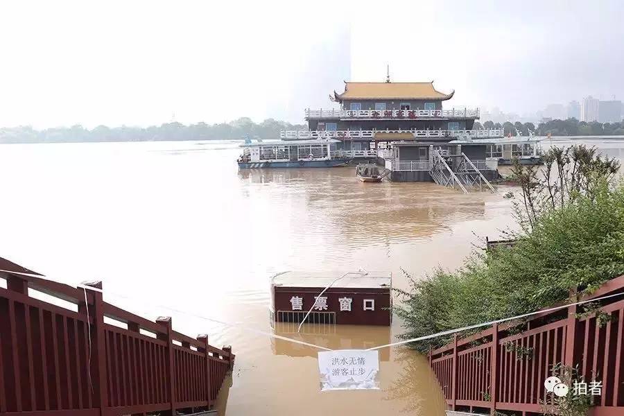 7月1日中午12时左右,长沙市,湘江西侧一码头售票厅被河水漫过。